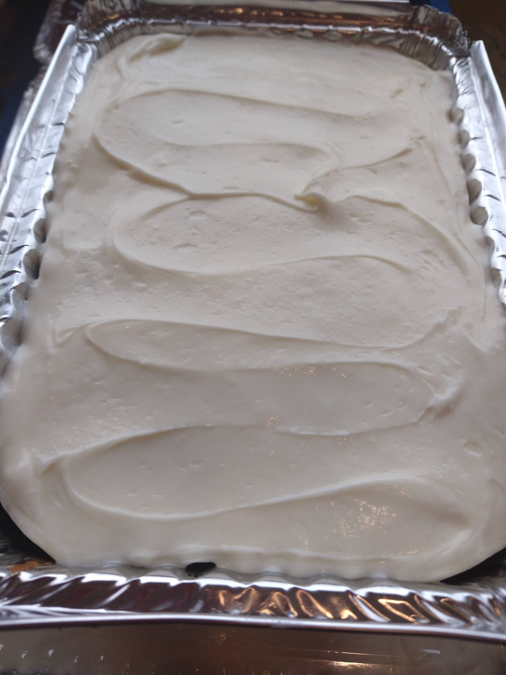 Carrot Cake with Pineapple and Cream Cheese Icing (No Nuts) comes in a 6” x 8” tin foil pan.  $10 retail.   Also available in a large Bundt style (12-16 pieces) for $32